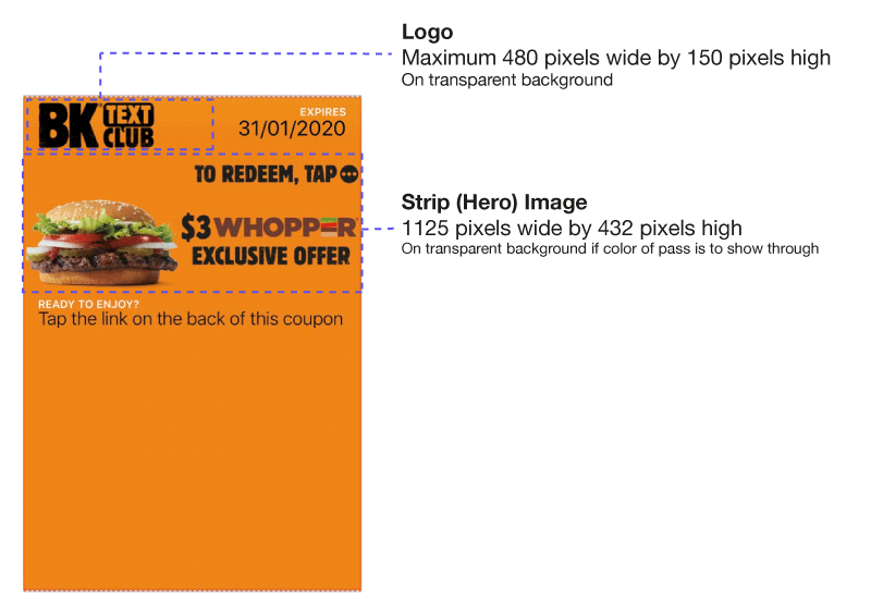 The pass layout allows a certain area on the front of the pass for each image. Images are scaled (preserving aspect ratio) to fill this allotted space. Images with a different aspect ratio than their allotted space are cropped after being scaled. The space allotted is as follows: