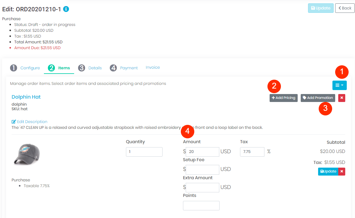 Edit any of the fields available on an order line item like, Quantity, Amount, Points, Percentage and click Update. The order totals will be recalculated and updated.