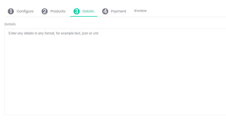 Navigate to Order Details section to put any order details in any format. You can use this section to store order related information in json or xml format.