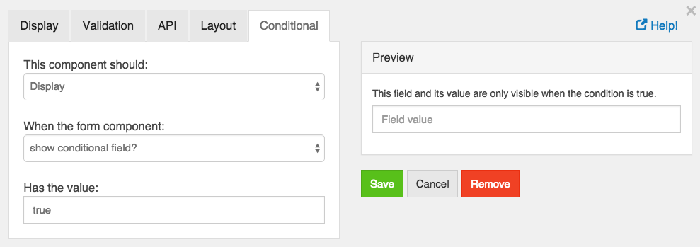 Any form component can use conditional logic to determine when to hide or display itself. The settings for a conditional field, are configured on the component itself, and can be found by viewing the Conditional tab within the components settings.