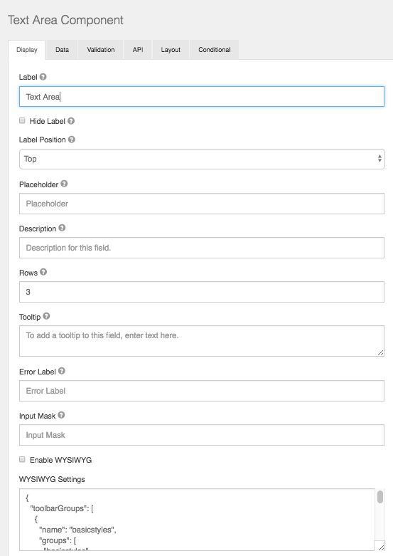 A Text Area has the same options as the textfield form component. The difference is that it will be a multi-line input field that allows for longer text. The Text Area can also be utilized as a CK Editor WYSIWYG for the end user which is configured within the component settings.