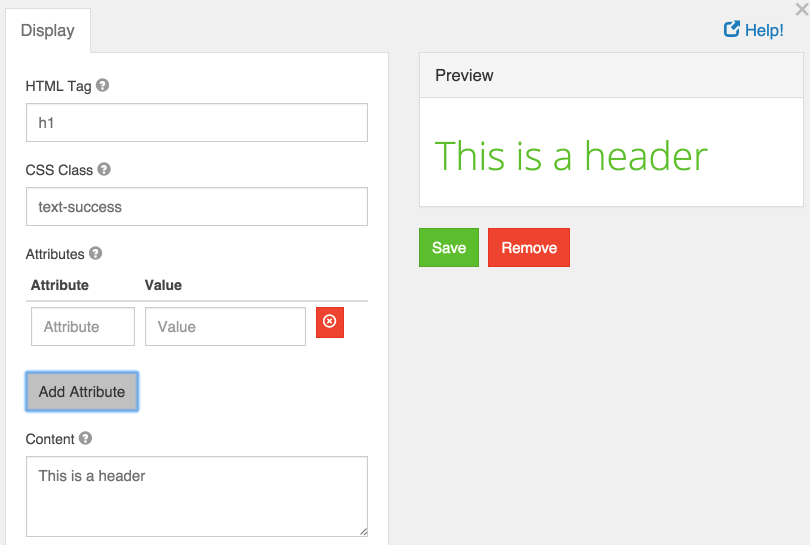 An HTML Element component may be added to a form to display a single HTML element. This is useful if you wish to quickly insert and configure some HTML in your form. All unsafe HTML is stripped before rendering to prevent cross-site scripting exploits. This includes tags like <script>