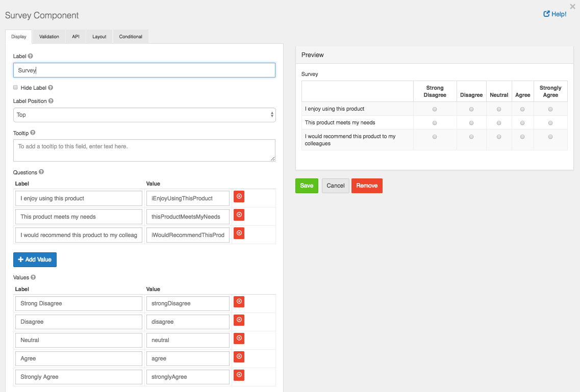 The Survey component works similar to the radio. Instead of one question, users are able to select a value for multiple questions which are configured within the component settings. Survey is a great component to utilize when asking multiple questions with the same context of answers or values.