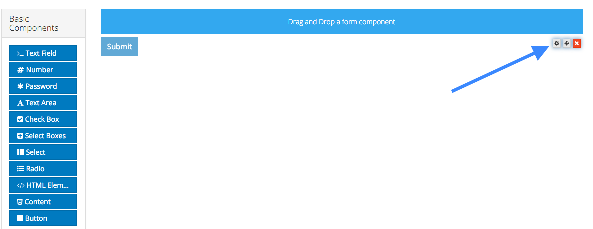 To edit a form component on a form, hover over the component and click the gear icon. You will then be presented with a settings form for the component.
