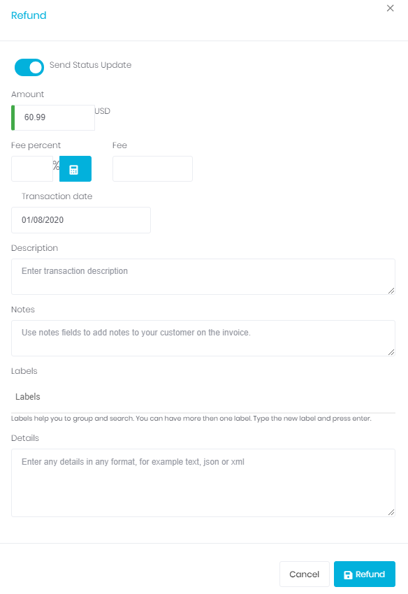 3. You can specify fee that you will charge the customer, the amount will be taken as a percentage or flat amount from the refund.
