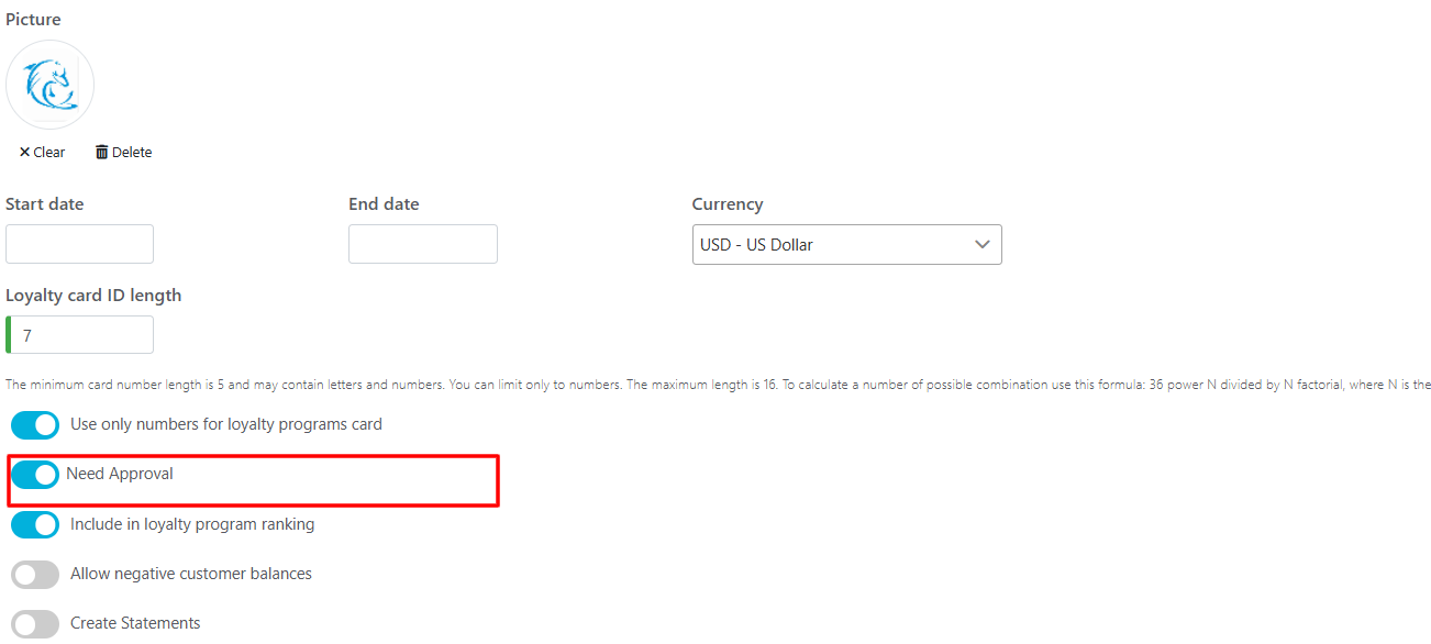 In Configure section for your loyalty program, select Require approval on new loyalty card