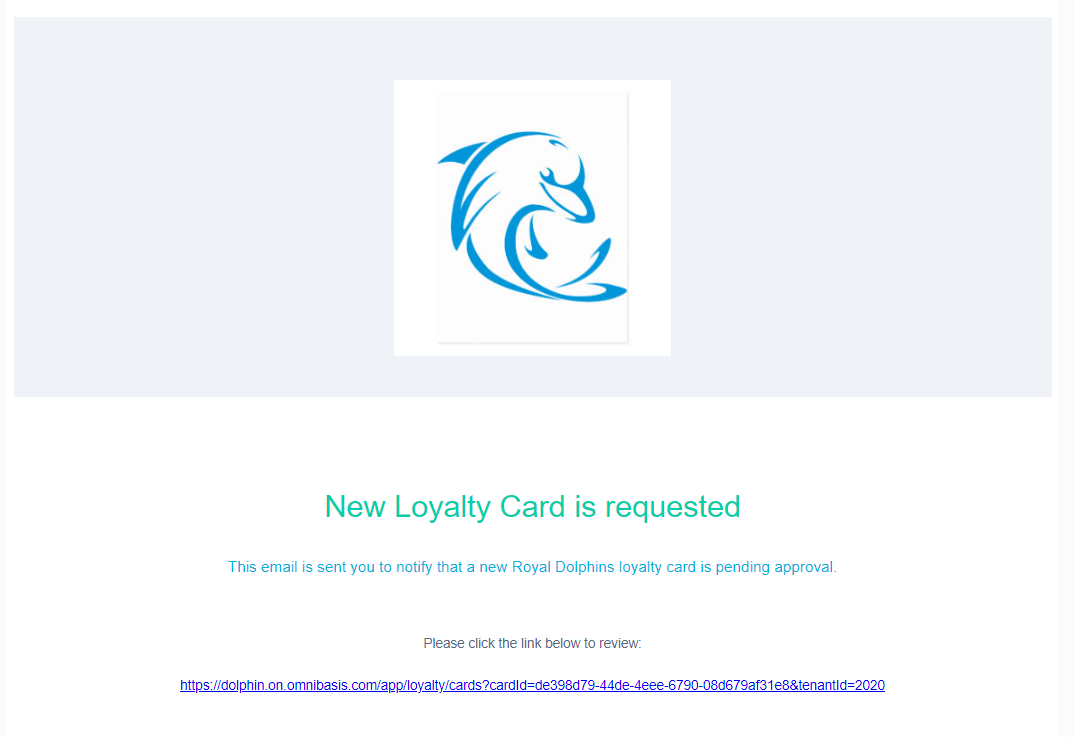 Once user self registers for a new loyalty card, admin account will receive email notification. Click the link to review and approve new loyalty card.