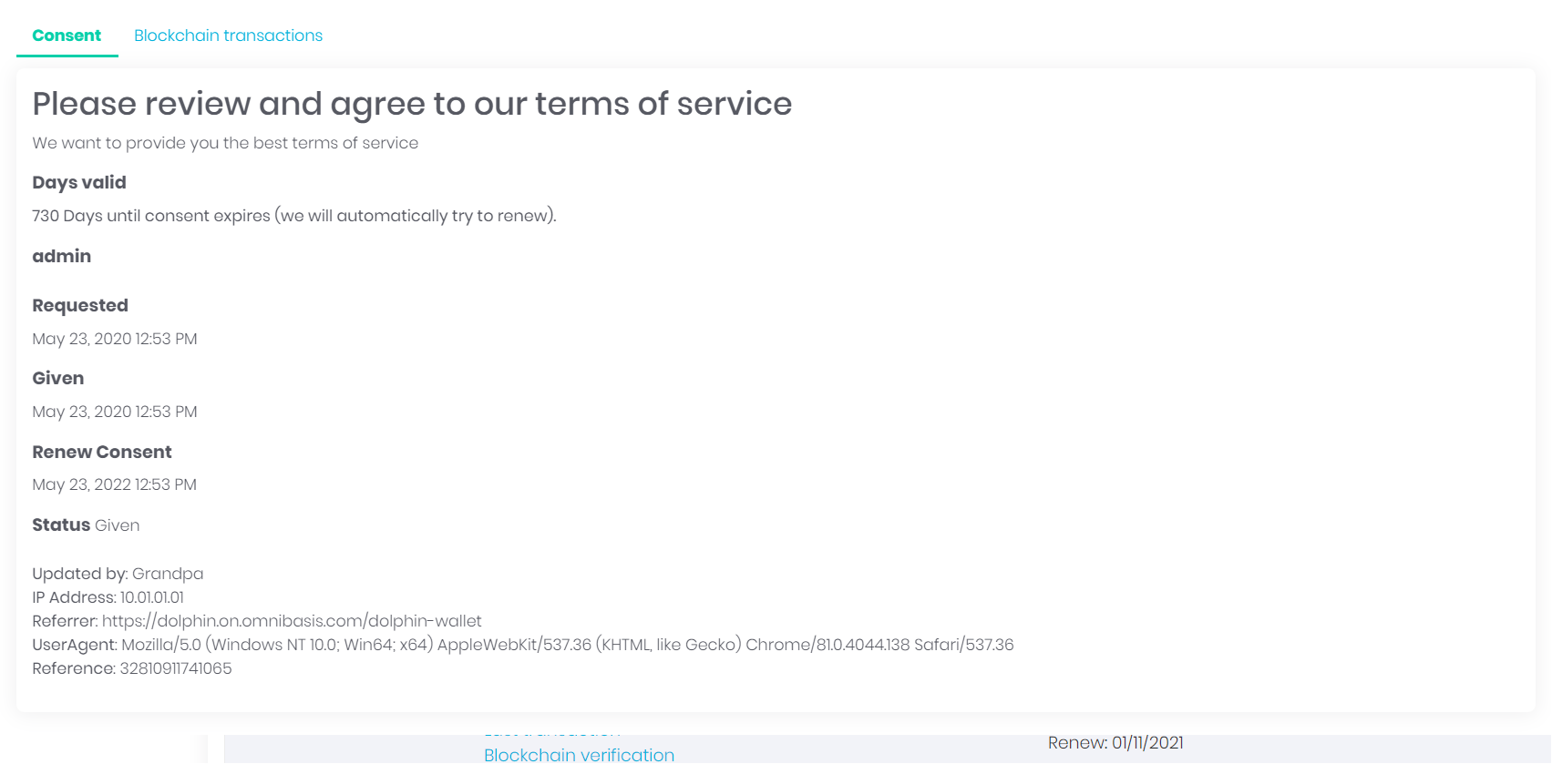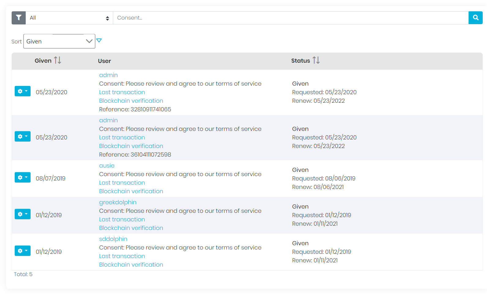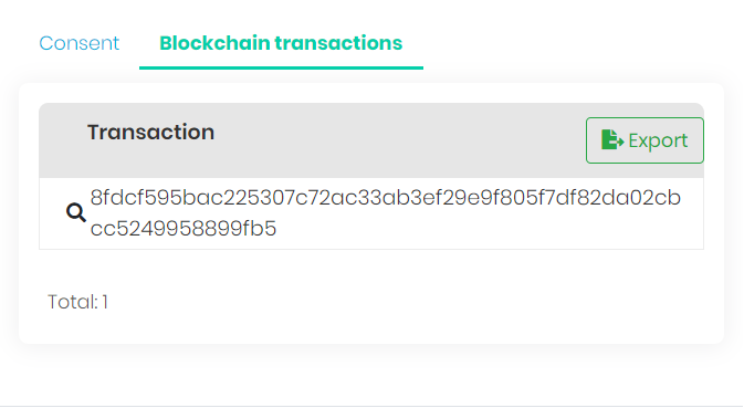 If you elected to track user consent on Blockchain, you can see all the verification transactions. Select Blockchain transactions section.