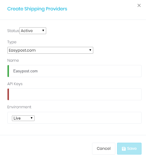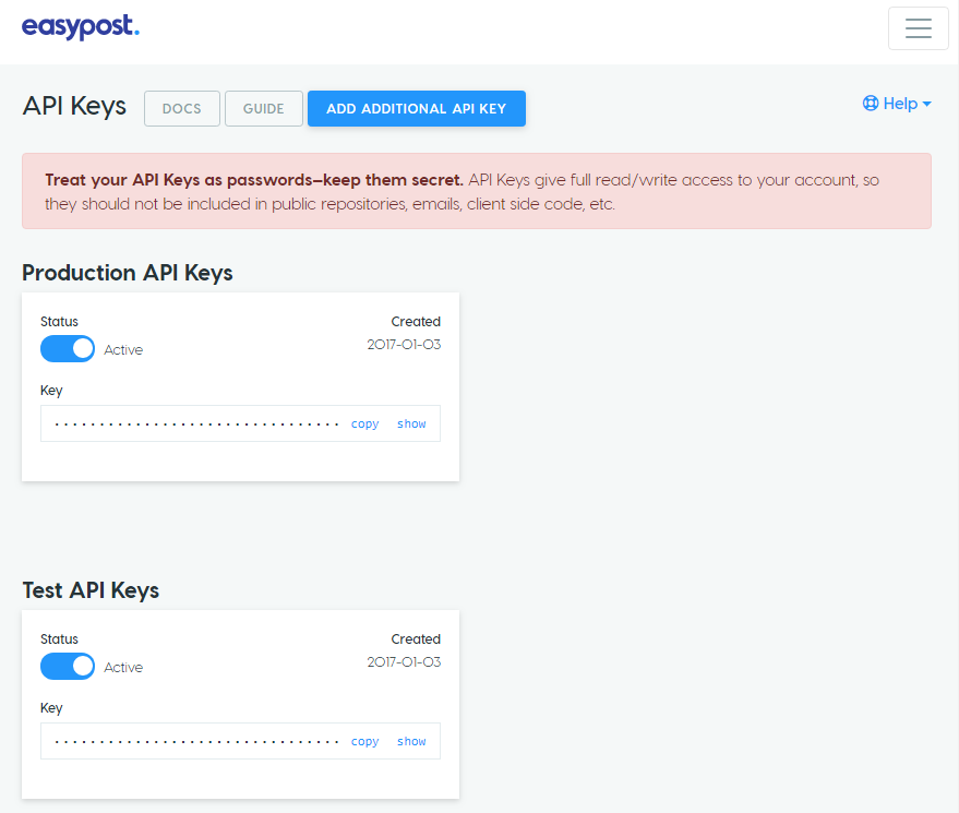For Easypost.com integration keys navigate to easypost website and select API keys under your username.
