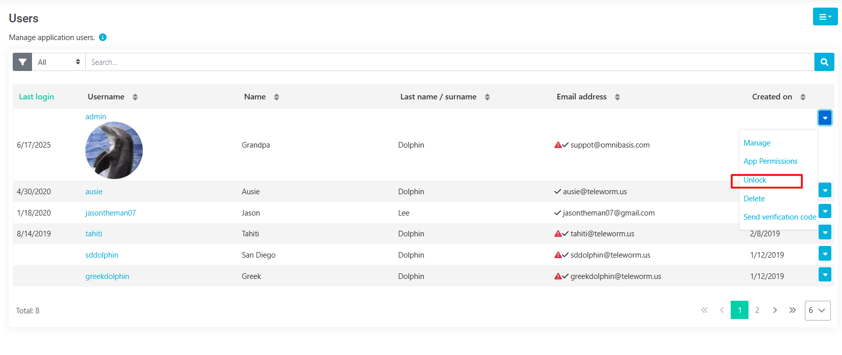 Next to the User name, open drop down to Edit user, manage App Permissions, Unlock it, or Delete.