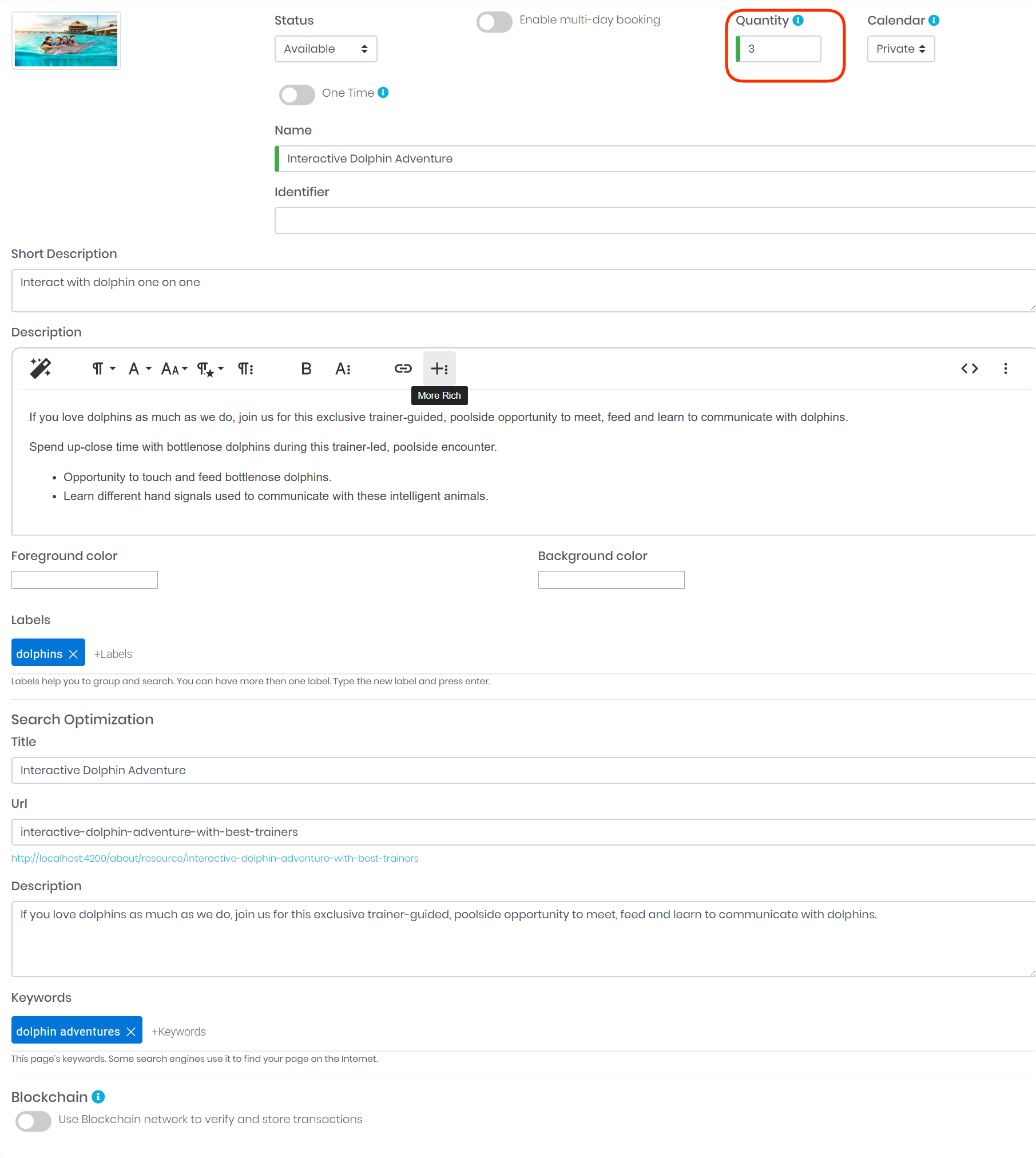 Note: if you set Quantity to 0, resource detail view will still load but booking on resource will be disabled.