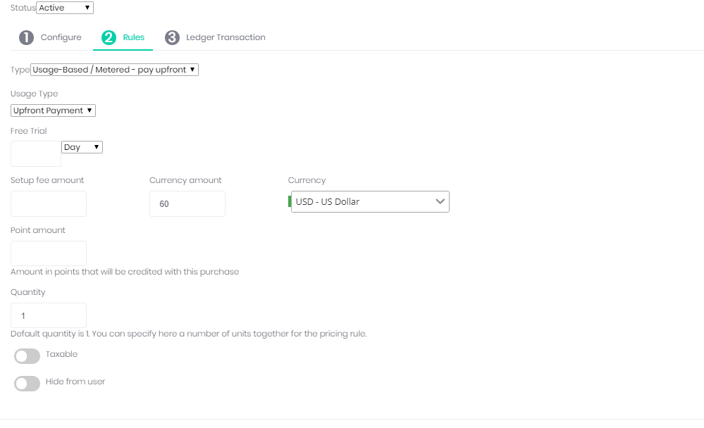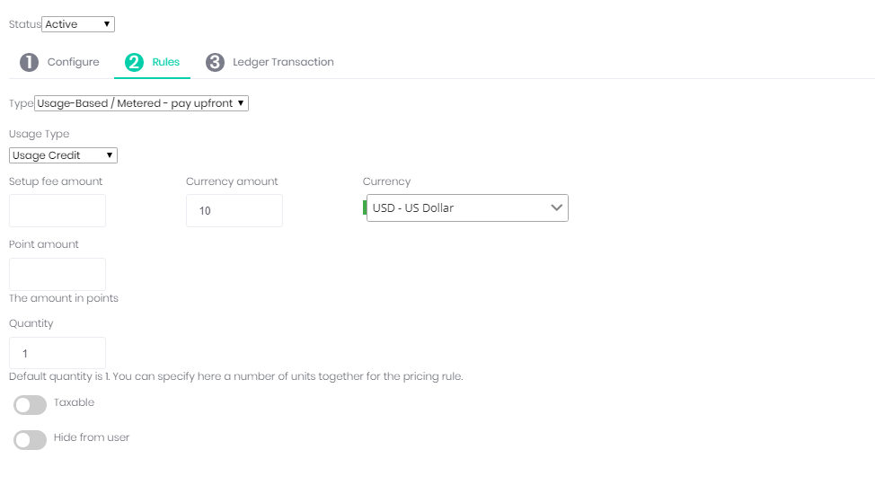 Note: You can only have one currency defined for each pricing rule. If you wish to support multiple currencies for a product, you must create separate pricing rule for each currency.