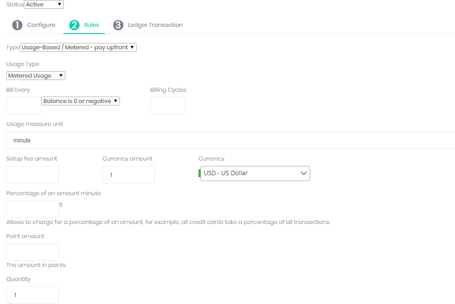 Navigate to 'Pricing Rule' section 'Rules' and select type 'Usage-based or Metered - Pay upfront'.