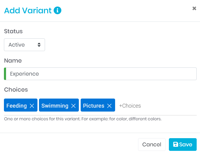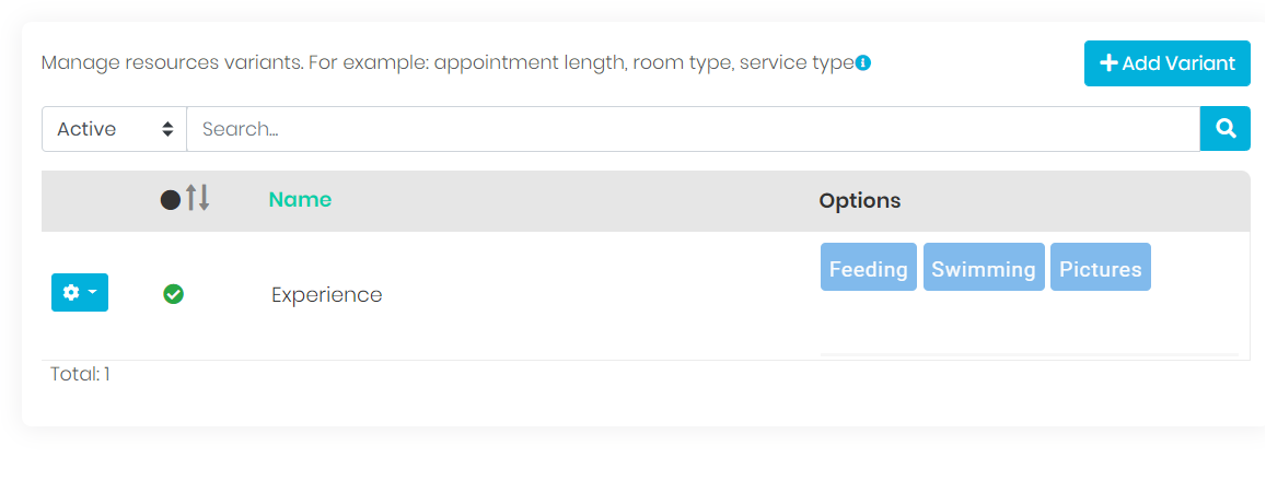 You add variants to a resource that comes in more than one option, for example variation on booking experience. Each combination of options for a resource is a variant for that resource.
