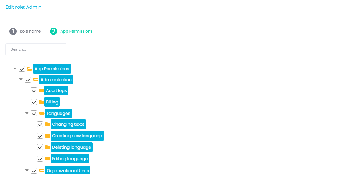 Navigate to App Permissions section to see all app permissions. One that assigned to this role will have checkbox next to it.