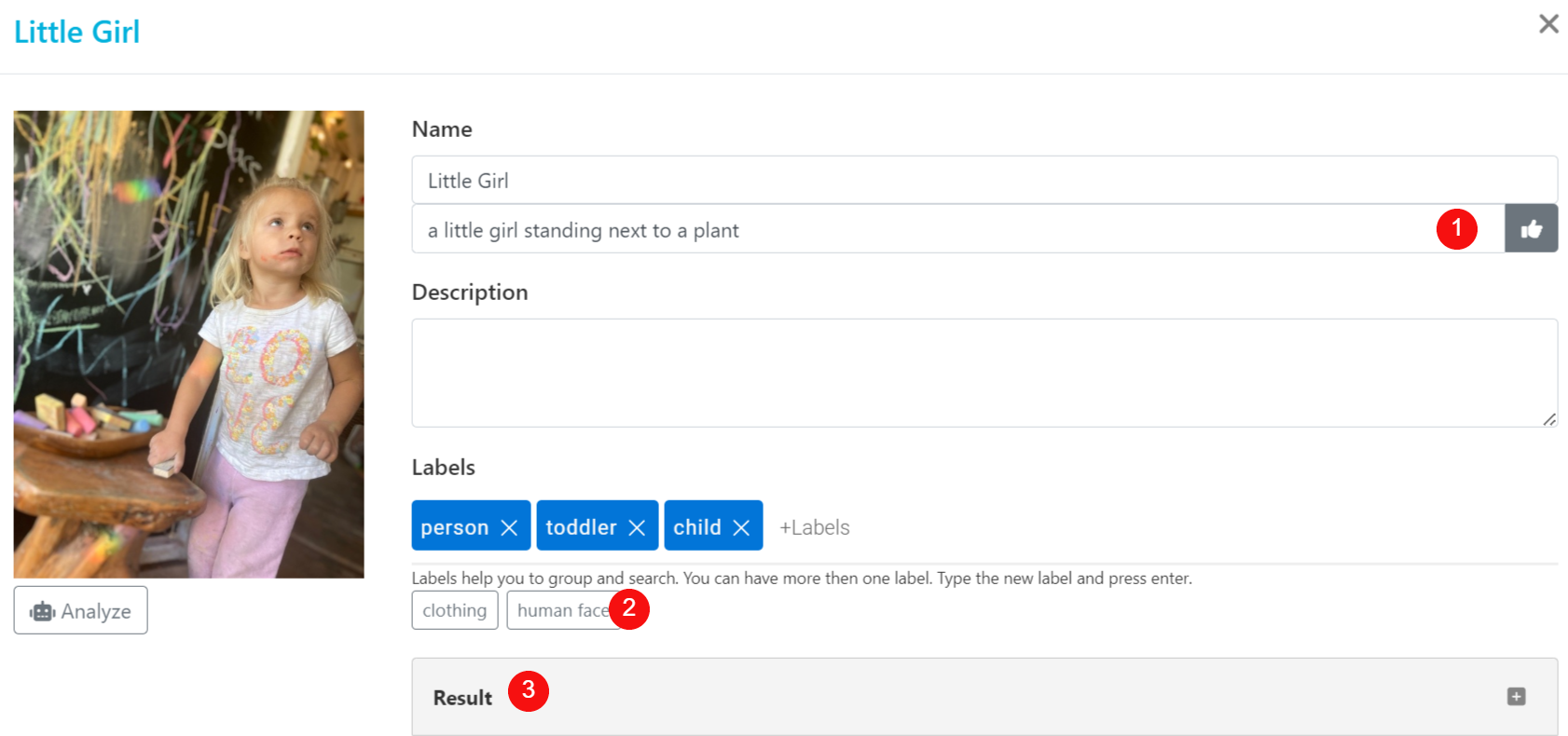 Click Analyze updating description on an existing image or select Analyze option when uploading an image.